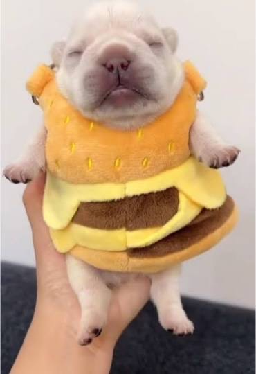 Monday November 3 2025 – Burger Pibble is a legend in the world of tiny dogs, known far and wide for his signature hamburger outfit and calm, satisfied expression. With his eyes gently closed and his round cheeks puffed out, he looks like he’s savoring the world’s greatest nap or maybe just the thought of an actual burger. His soft costume, complete with plush lettuce, cheese, and sesame-seed bun, isn’t just clothing it’s an identity. Wherever Burger Pibble goes, joy follows. Everyone laughs, and the grumpiest souls can’t resist smiling at his gentle charm.